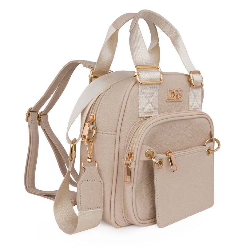 Cream women's backpack. Made of eco-leather. It features 2 interior compartments, one with a zipper, and 3 exterior compartments with zippers on the front and back. Adjustable, detachable shoulder straps, adjustable backpack straps, and a detachable adjustable crossbody strap. The wallet is detachable. Dimensions: H 25cm, W 23cm, D 15cm.*Designed exclusively in Greece by De Raggi designers."