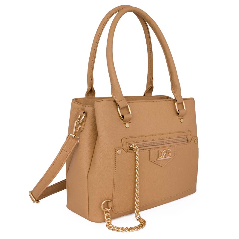 Women's shoulder bag in beige colour. Made of eco-leather. It features 3 separate autonomous compartments with individual zippers, 2 internal slots (one with a zipper), and 1 external zipper pocket on the front. Detachable keychain with zipper. Dimensions: H 25cm, W 32cm, D 15cm. "Designed exclusively in Greece by De Raggi designers".